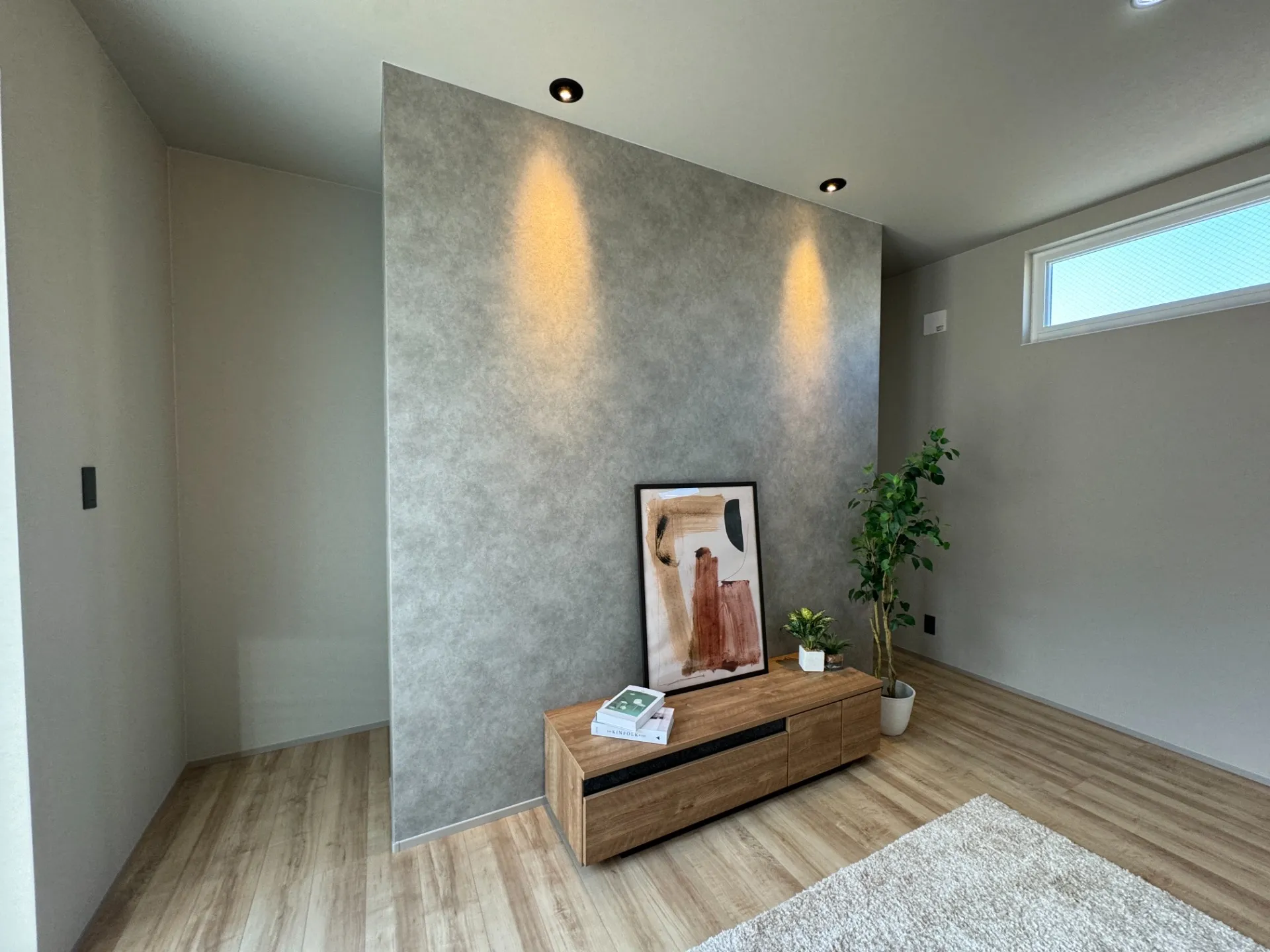 ・リビング:高天井に吊るしたペンダントライト+間接照明で、広さと落ち着きを両立