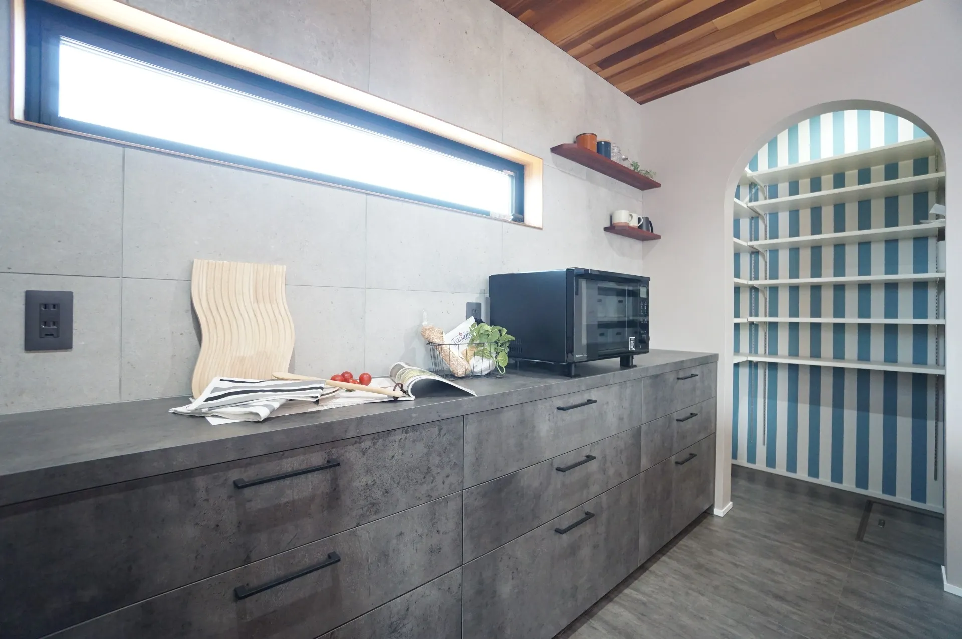 キッチンからすぐ手が届く場所に設けることで、料理の流れが止まらず、作業効率もアップ。家事の時短にもつながります。