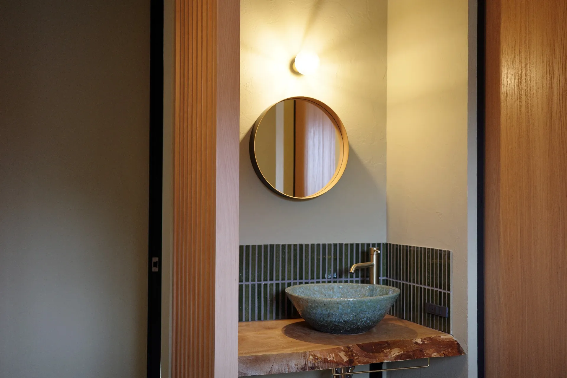 最近の造作洗面台では、自然素材を活かしたナチュラルなデザインが注目されています。木とタイルを組み合わせたり、間接照明を取り入れたりすることで、洗面所がまるでインテリアの一部のような空間になります。